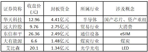 从封板资金来看,周五的涨停板个股中,封板资金排名前 5 的个股包括华天科技、远大控股、东信和平、大有能源、艾比森。欢迎大家关注微信公众号 「道达号」,其 「道达涨停复盘」 栏目为大家解读。