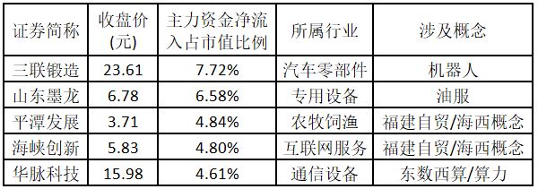 主力资金净流入金额占市值比例排名前 5 的个股分别为三联锻造、山东墨龙、平潭发展、海峡创新、华脉科技。