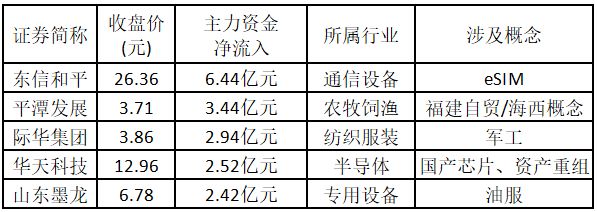 从主力资金来看,周五的涨停板个股中,主力资金净流入金额排名前 5 的个股分别为东信和平、平潭发展、际华集团、华天科技、山东墨龙。