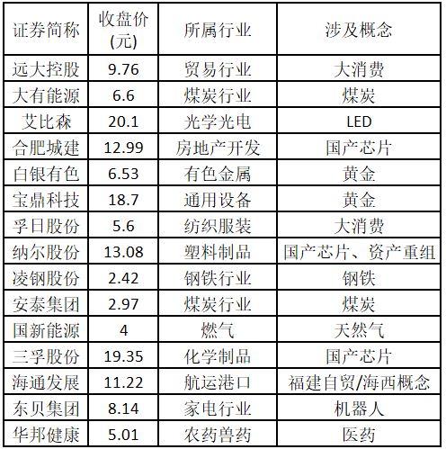 涨停板个股中,股价创出近一年新高的个股有 15 只 (不包括创出历史新高的个股),包括远大控股、大有能源、艾比森、合肥城建、白银有色、宝鼎科技、孚日股份、纳尔股份、凌钢股份、安泰集团、国新能源、三孚股份、海通发展、东贝集团、华邦健康,具体如下表所示。