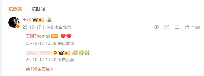 随后,小米集团公关部总经理王化在该条博文评论区回复 「拥抱」 表情。王腾也回复比心表情。
