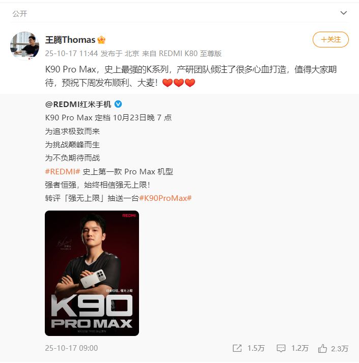 值得注意的是,10 月 17 日前小米高管 王腾 Thomas 转发红米手机官方推文并表示:K90 Pro Max,史上最强的 K 系列,产研团队倾注了很多心血打造,值得大家期待,预祝下周发布顺利、大麦!