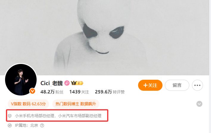 查看魏思琪社交媒体账号,认证信息已显示为 「小米手机市场部总经理,小米汽车市场部副总经理」。