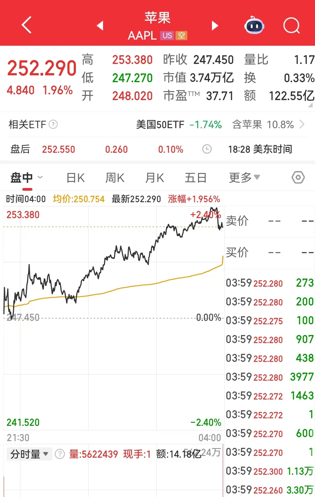 热门科技股涨跌不一,特斯拉涨 2.46%,市值一夜增加 351 亿美元(约合人民币 2502 亿元);苹果涨近 2%;甲骨文跌超 6%;超微电脑、ARM 跌超 3%;博通跌超 1%。