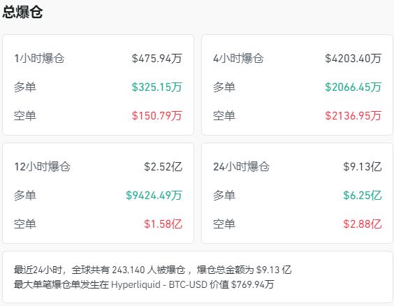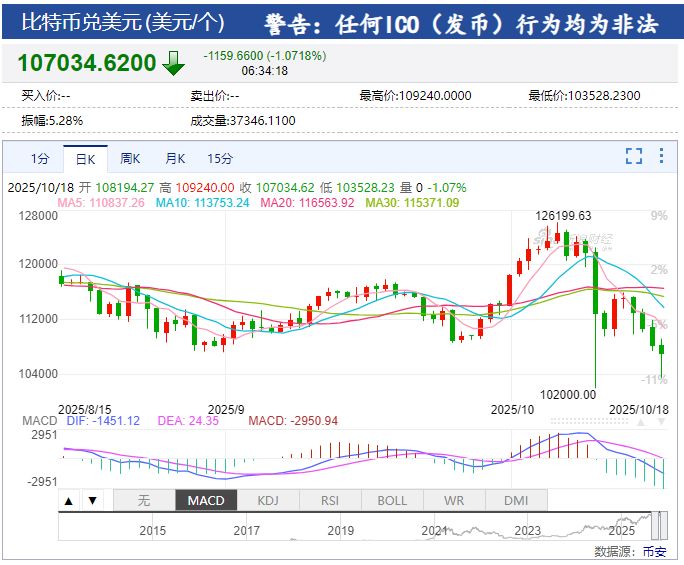 比特币盘中一度跌破 107000 美元。截至 10 月 18 日发稿,比特币报 107034 美元。加密货币全网 24 小时共有 243217 人被爆仓,爆仓总金额为 9.13 亿美元 (约合人民币 65.1 亿元)。