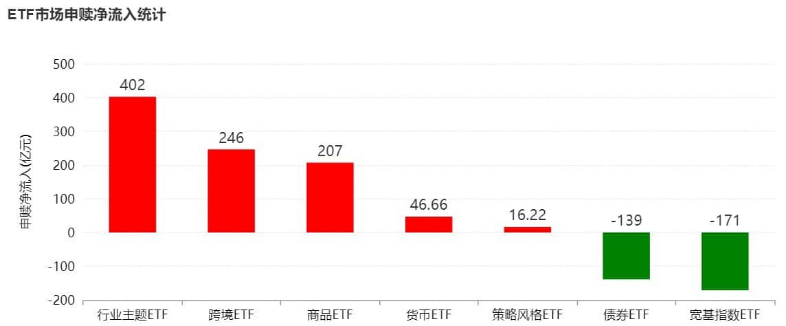 数据显示,本周沪深两市股票型 ETF 和跨境型 ETF 合计净流入约 494 亿元,行业主题 ETF 净流入 402 亿元。