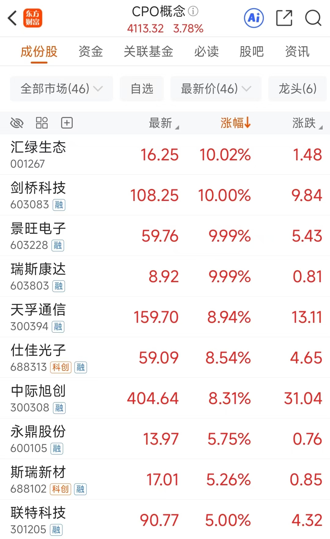 CPO 概念在 10 月 20 日早盘表现强势,早盘收盘指数涨 3.78%。板块中汇绿生态、剑桥科技、景旺电子、瑞斯康达纷纷涨停;天孚通信、仕佳光子、中际旭创、新易盛等也涨幅靠前。