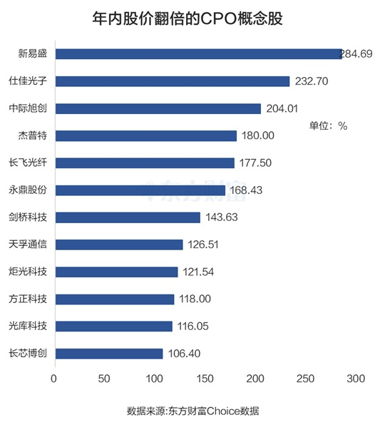 个股而言,新易盛暂居 CPO 概念年内 「涨幅王」 宝座,累计上涨 284.69%。仕佳光子紧随其后,年内上涨 232.7%。中际旭创居第三位,年内上涨 204.01%。整个概念板块年内上涨中位数为 38.33%。