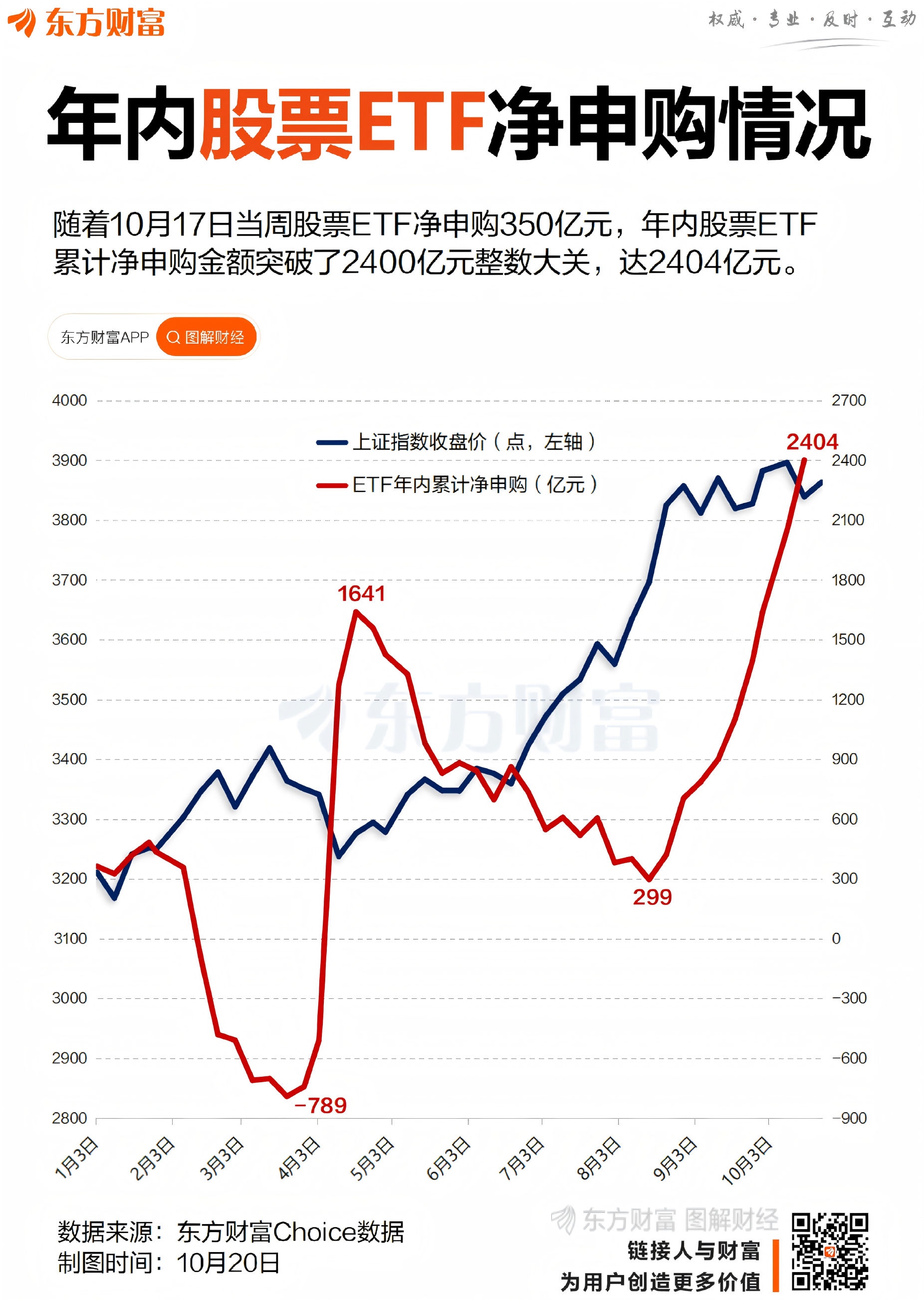 据东方财富Choice 数据,随着 10 月 17 日当周股票 ETF 净申购 350 亿元,年内股票 ETF 累计净申购额突破了 2400 亿整数大关,达 2404 亿元。