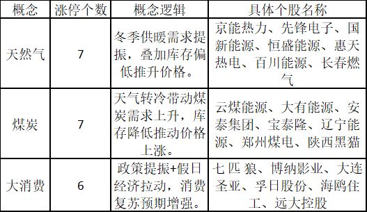 从概念特征来看,今日涨停板个股中,天然气、煤炭、大消费概念的个股最多。