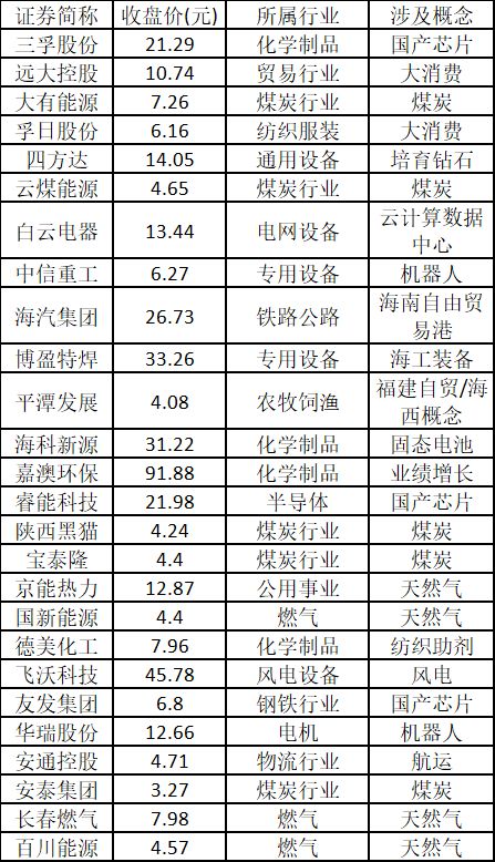 涨停板个股中,股价创出近一年新高的个股有 26 只 (不包括创出历史新高的个股),包括三孚股份、远大控股、大有能源、孚日股份、四方达、云煤能源、白云电器、中信重工、海汽集团、博盈特焊、平潭发展、海科新源、嘉澳环保、睿能科技、陕西黑猫、宝泰隆、京能热力、国新能源、德美化工、飞沃科技、友发集团、华瑞股份、安通控股、安泰集团、长春燃气、百川能源,具体如下表所示。