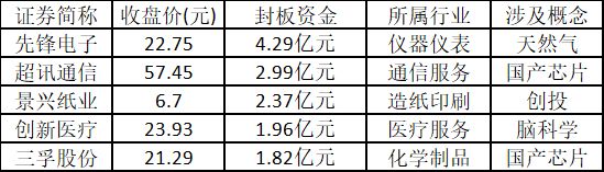 从封板资金来看,今日涨停板个股中,封板资金排名前 5 的个股包括先锋电子、超讯通信、景兴纸业、创新医疗、三孚股份。欢迎大家关注微信公众号 「道达号」,其 「道达涨停复盘」 栏目为大家解读。