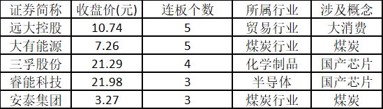从连板情况来看,今日首板个股有 66 只;2 连板的个股有 5 只;3 连板及以上的个股有 5 只。今日连板数排名前 5 的个股包括远大控股、大有能源、三孚股份、睿能科技、安泰集团,具体如下表所示。