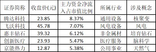 主力资金净流入金额占市值比例排名前 5 的个股分别为腾达科技、飞沃科技、惠丰钻石、创新医疗、京能热力。