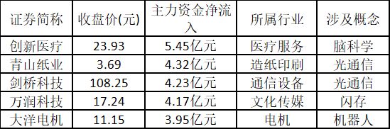 从主力资金来看,今日涨停板个股中,主力资金净流入金额排名前 5 的个股分别为创新医疗、青山纸业、剑桥科技、万润科技、大洋电机。