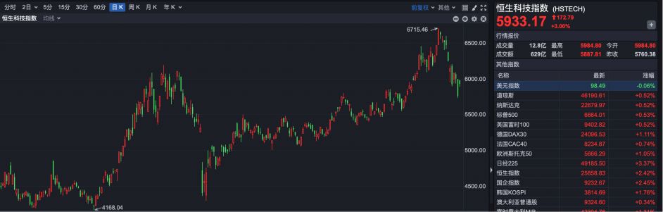 恒生科技指数报收于 5933.17 点,上涨 172.79 点,涨幅 3%。