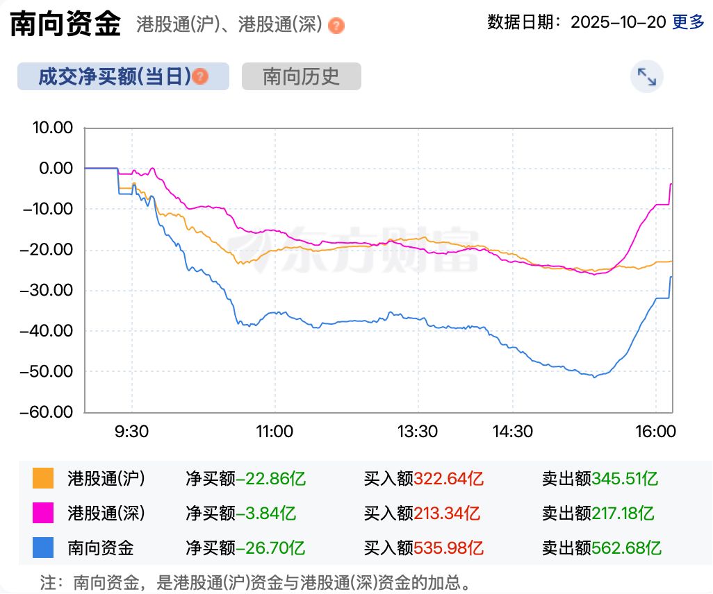 资金方面,尽管港股市场反弹,但南向资金却开始净卖出。今日盘中,南向资金一度净卖出超过 50 亿港元,但尾盘资金有所回流。截至收盘,南向资金净卖出港股金额超 26 亿港元。