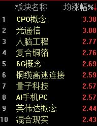 板块方面,F5G 概念、CPO 概念、光通信模块、煤炭行业等位于涨幅榜前列,贵金属、珠宝首饰、草甘膦等则表现不佳,领跌市场。