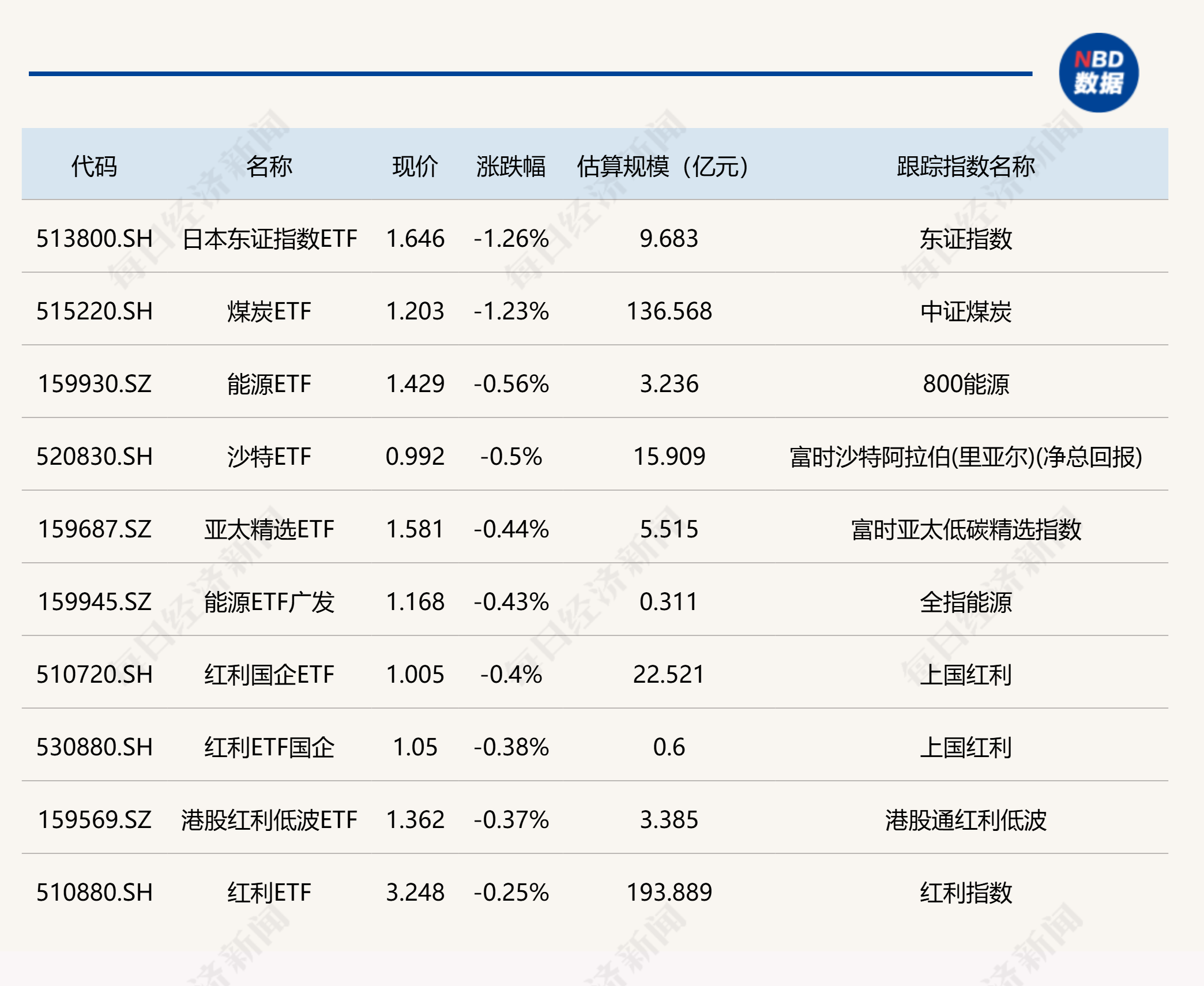 下跌方面,日本东证指数 ETF、煤炭 ETF 跌超 1%。