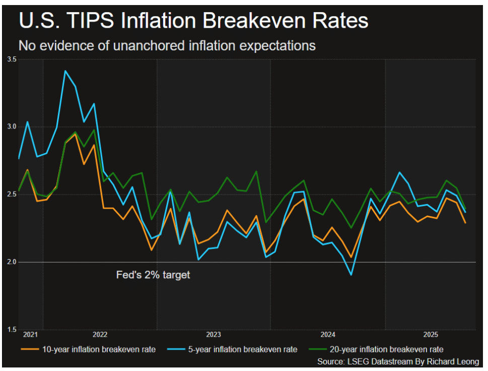 美国通胀保值国债 (TIPS) 市场也呈现类似趋势。10 年期 TIPS 盈亏平衡通胀率 (本质上是债券投资者对十年后通胀水平的预期) 上周跌至 2.275%,为 6 月以来最低;更值得关注的是,30 年期 TIPS 盈亏平衡通胀率跌至 2.21%,创下 5 月以来的新低。