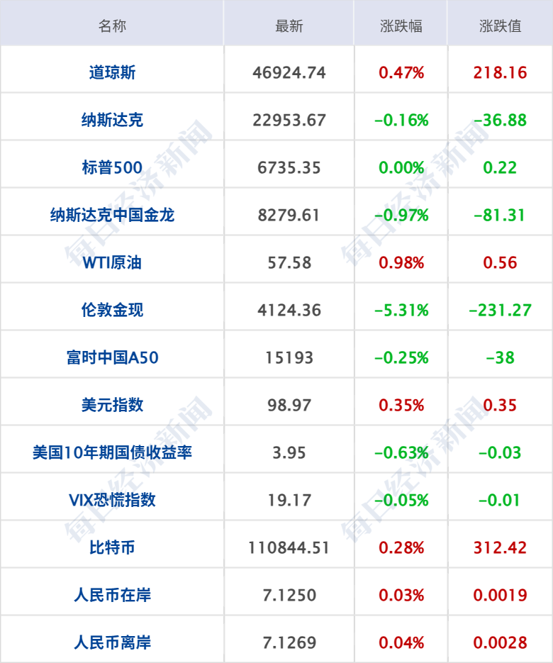 美股三大指数收盘涨跌不一,道指涨 0.47%,标普 500 指数平收,纳指跌 0.16%,其中,道指再创历史新高;费城金银指数大跌 9.57%;大型科技股涨跌不一,亚马逊涨超 2%,英特尔、苹果、微软、Meta 小幅上涨;谷歌跌超 2%,特斯拉跌超 1%,英伟达小幅下跌;通用汽车涨近 15%,创最近五年来最佳单日表现;「人造肉第一股」Beyond Meat 大涨超 146%,近三个交易日累计涨幅约 600%。纳斯达克中国金龙指数跌 0.97%,中概股多数下跌;阿里巴巴跌近 4%,京东、名创优品跌近 3%,百度跌超 2%;哔哩哔哩逆势涨近 6%。