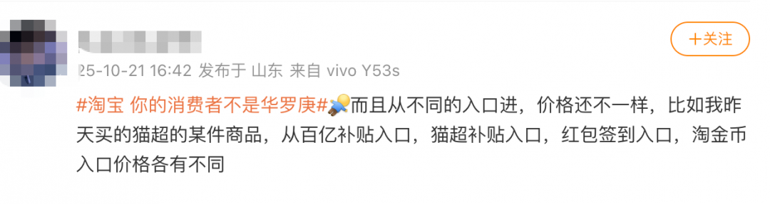 首先是价格不透明,同一商品不同入口,价格差异大。有网友分享,10 月 20 日在天猫超市买东西,从百亿补贴入口、猫超补贴入口、红包签到入口、淘金币入口打开,价格各有不同。