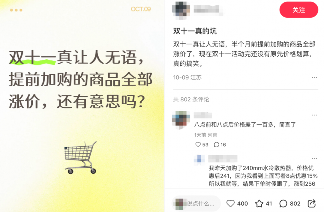 而这种情况还不是双 11 特例,在小红书等平台,此前已有不少网友反映遇到过类似问题,甚至出现 「不同时不同价」「不同人不同价」 的区别对待。