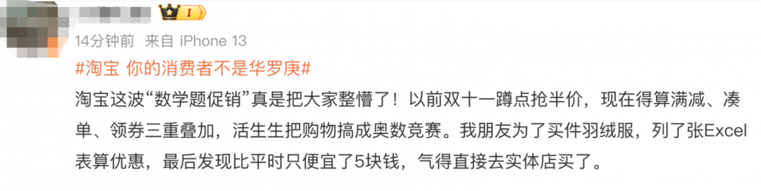 但到了 21 日,「淘宝 你的消费者不是华罗庚」 即冲上微博热搜,不少网友吐槽双 11「活生生把购物搞成了数学竞赛」,而且 「七算八算,搞半天浪费不少脑细胞,还没便宜多少」,直呼 「太坑了」。