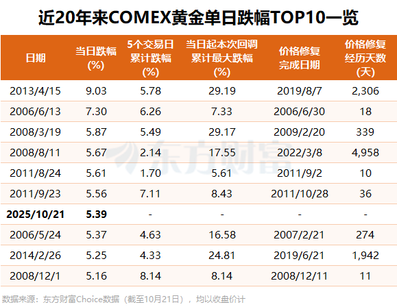 纽约商品交易所 12 月黄金期货收于每盎司 4109.10 美元,下跌 5.7%。根据道琼斯市场数据公司对 FactSet 数据的分析,这是自 2013 年 6 月 20 日以来最大的单日百分比跌幅。而现货黄金价格盘中跌幅一度达到 6.3%,这一跌幅创下了自 2013 年 4 月以来的最大单日下跌纪录,最终收跌 5.3%,至每盎司 4123.85 美元。