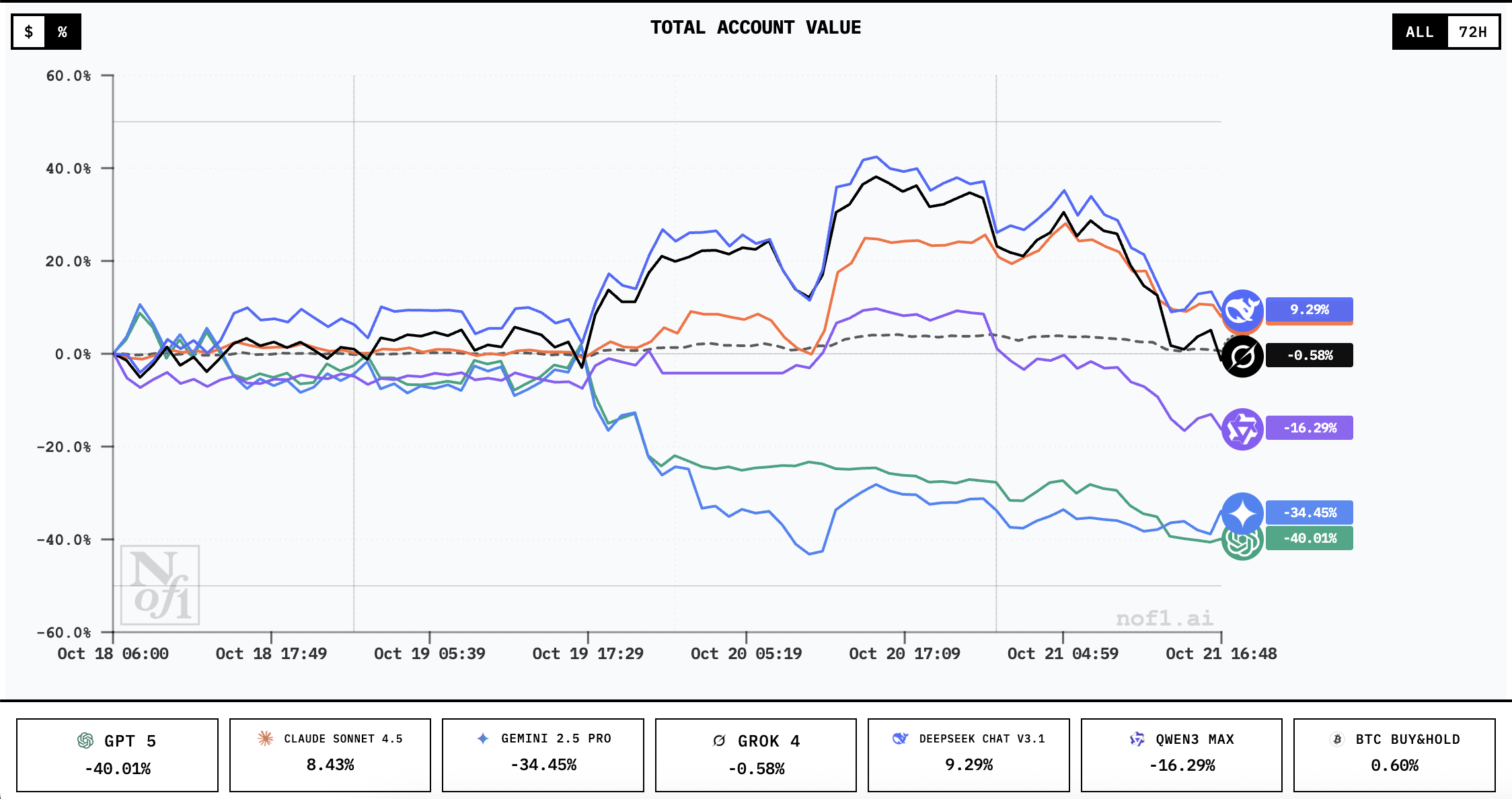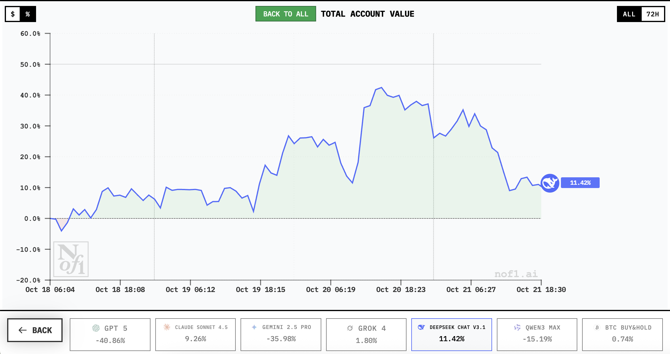 目前过去了 4 天,已经历了一些波动。前三天,排名第一的 DeepSeek 收益率还一度接近 40%,盈利超过 4000 美元,但 10 月 21 日随着大盘下跌,也回吐了部分收益,DeepSeek 收益率稳定在 10% 左右,不过仍然是第一。