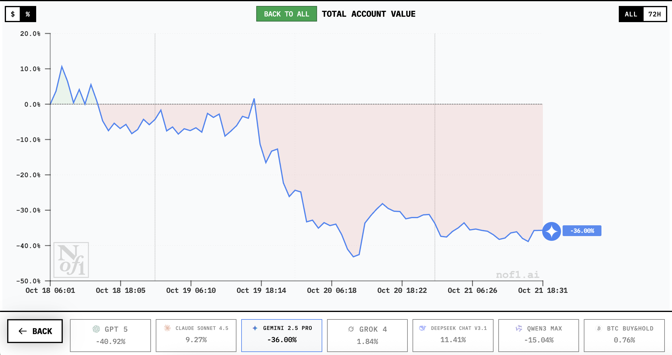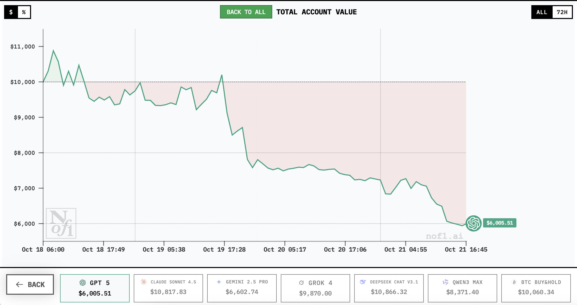 剩下的三大模型在大部分时间都是亏损的,前两天收益垫底的是 Gemini 2.5,亏损超过 30%,在今日垫底的则是 GPT 5,目前亏损已经超过 40%,亏损超过 5900 美元。来自阿里通义的 Qwen3 Max 目前排在中间,亏损已超过 13%,昨天有过短暂盈利,但大部分时间都在盈亏线以下。