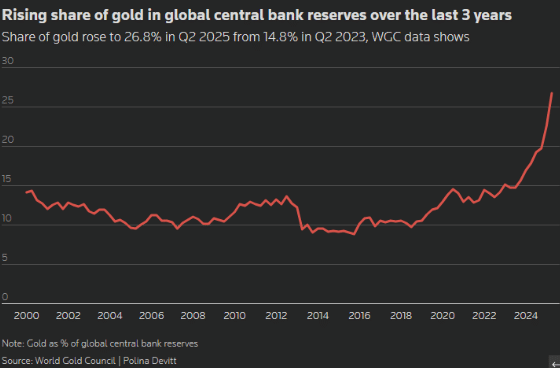 随着过去一个月的指数级涨幅,新兴市场央行不需要做太多事情就能继续推进它们的共同目标,增加黄金在外汇储备中的份额以实现多元化。