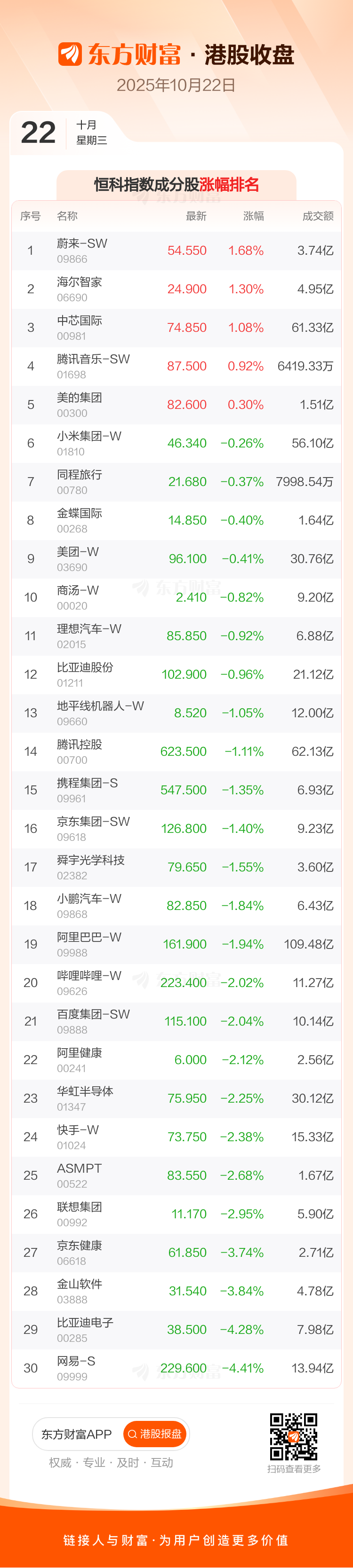港股10月22日收盘走低,恒生指数收报25781.77点,跌245.78点,跌幅0.94%;恒生科技指数收报5923.09点,跌84.85点,跌幅1.41%。恒生指数成分股中国药控股、泡泡玛特、申洲国际涨幅居前,周大福、石药集团、网易-S跌幅靠前。恒生科技指数成分股中蔚来-SW、海尔智家、中芯国际涨幅居前,网易-S、比亚迪电子、金山软件跌幅靠前。 免责声明:本文基于AI生产,仅供参考,不构成任何投资建议,据此操作风险自担。(东方财富研究中心) 文章转载自东方财富