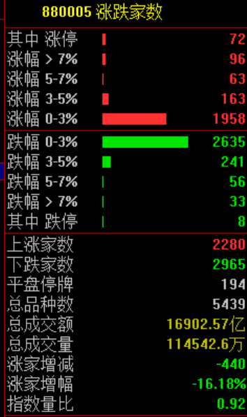 市场共 2280 只个股上涨,72 只个股涨停,2965 只个股下跌。