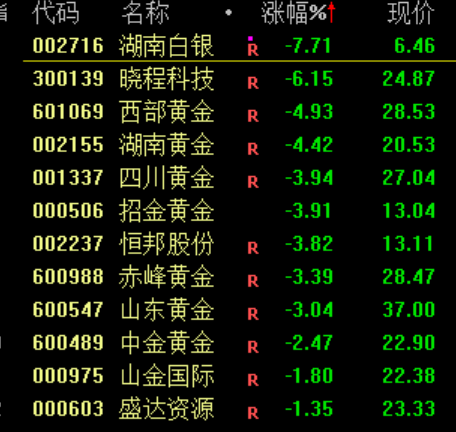 下跌方面,黄金概念股下挫,湖南白银跌超 7%。消息面上,此前现货黄金一度下跌 6.3%,创下自 2013 年 4 月以来的最大单日跌幅。现货白银日内一度跌幅达 8.7%,创下自 2021 年以来的最大跌幅。