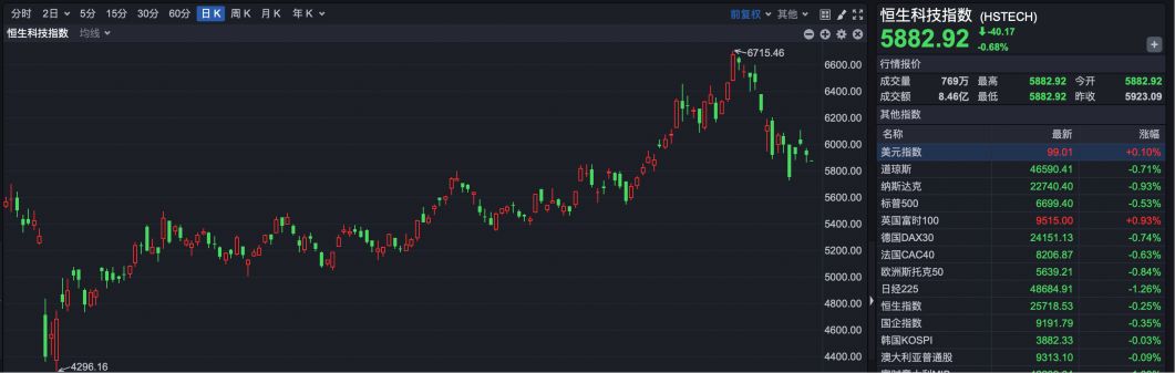 恒生科技指数报 5882 点,下跌 40.17 点,跌幅 0.68%。