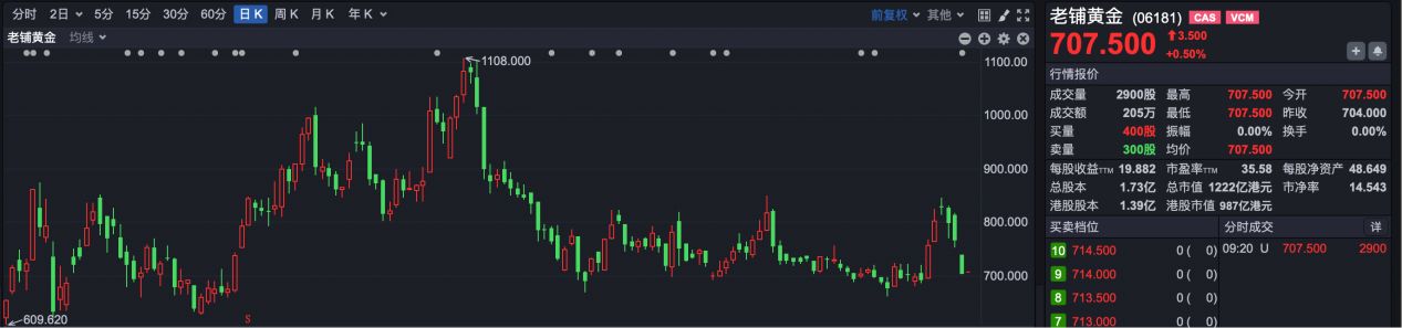 今日早间,老铺黄金高开 0.5%,报 707.50 港元。今年 7 月 8 日,老铺黄金股价创下 1108 港元后开始持续调整。
