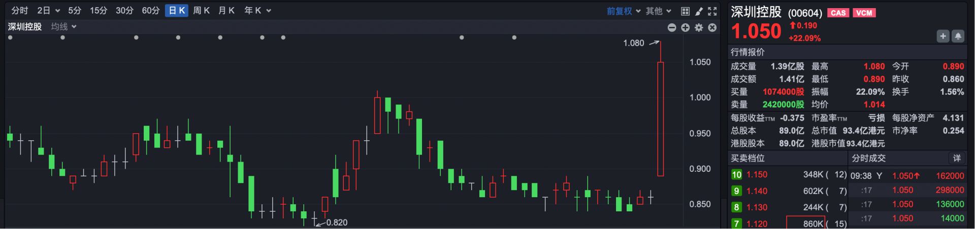 焦点板块方面,粤港澳概念股走强。其中,深圳控股 (00604.HK) 涨近 20%、粤海置地 (00124.HK)、碧桂园 (02007.HK)、深圳国际 (00152.HK) 等涨超 1%。