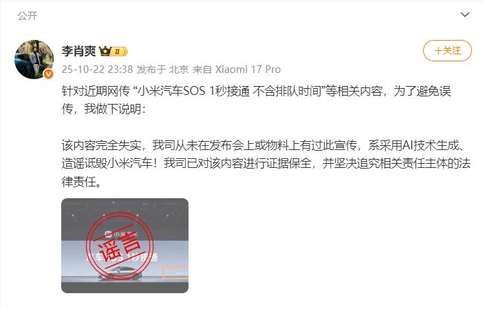 针对近期网传 「小米汽车 SOS 1 秒接通 ,不含排队时间」 等相关内容,小米汽车副总裁李肖爽发文称,该内容完全失实,公司从未在发布会上或物料上有过此宣传,系采用 AI 技术生成、造谣诋毁小米汽车。公司已对该内容进行证据保全,并坚决追究相关责任主体的法律责任。