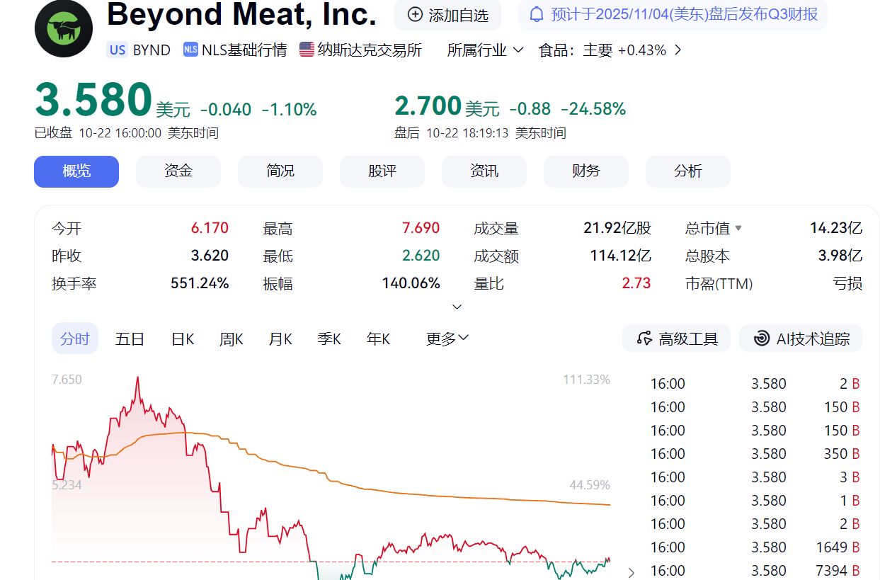 此外,周三美股开盘后,Beyond Meat 股价一度因为涨幅过大而多次暂停交易。截至收盘,公司股价跳水翻绿跌 1.10%。在最近 4 个交易日,公司股价涨幅一度接近 12 倍。