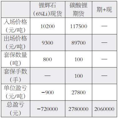 从项目操作过程来看,入场时,卖出期货合约均价为 117500 元/吨,现货买价为 10200 元/吨;出场时,期货合约平仓均价为 89700 元/吨,现货卖价为 9300 元/吨。期货盈利总计 278 万元,现货亏损总计 72 万元,期现组合盈利总计 206 万元,有效地降低了锂辉石库存市场风险,达成企业风险管控与盈利增益的双重目标。
