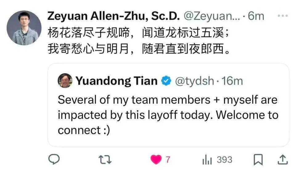 汪滔在备忘录中强调:「此次调整绝不意味着削减投资。相反,我们将继续招募行业顶尖、AI 原生背景的人才。」 然而,当田渊栋的同事朱泽园在社交媒体上引用唐诗 「我寄愁心与明月,随君直到夜郎西」 表达惋惜时,AI 研究界感受到的是一种时代变迁的苍凉。