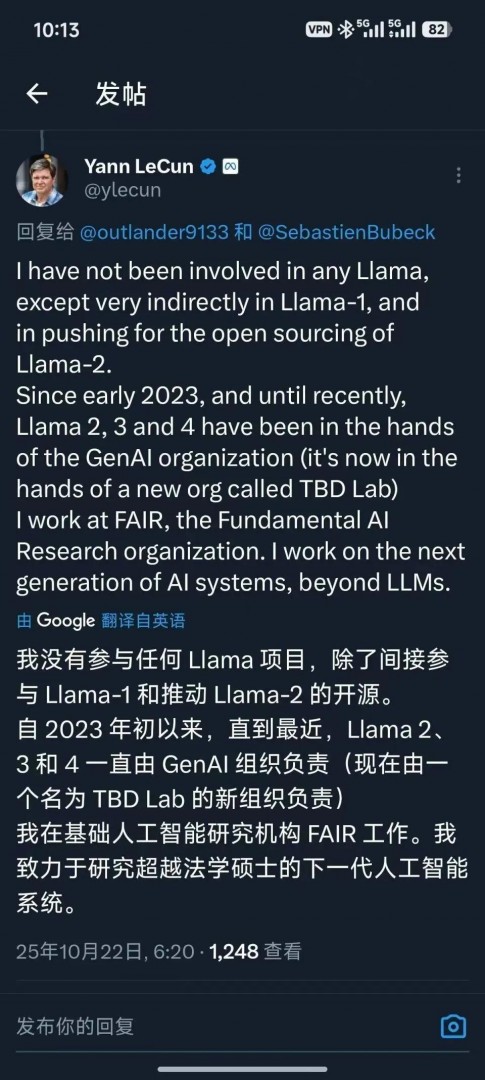 与此同时,Meta 首席 AI 科学家杨立昆在裁员当天秀出与吴恩达的合照,并发表声明与 Llama 4 项目切割。他强调,除了间接参与 Llama-1 的开源推广,自 2023 年初以来,Llama 2、3 和 4 一直由 TBD 实验室负责。这一表态被业界解读为 Meta 内部研究方向的重大调整。