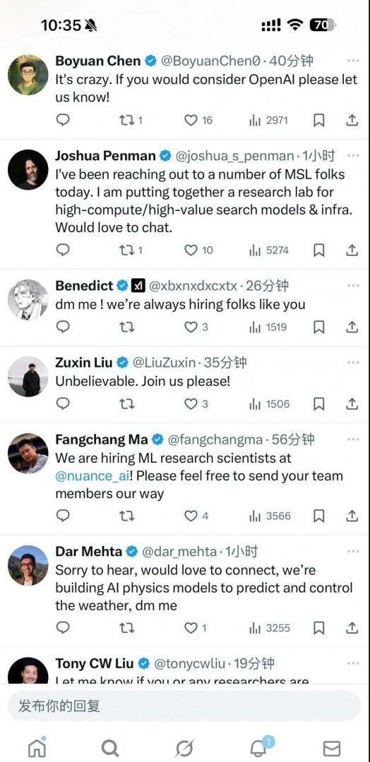 在田渊栋宣布离职的帖子下,OpenAI、XAI、Anthropic 等头部 AI 公司纷纷抛出橄榄枝。这种公开 「抢人」 现象,在传统的科技行业裁员中并不常见,凸显了顶尖 AI 研究人员的稀缺性和价值。