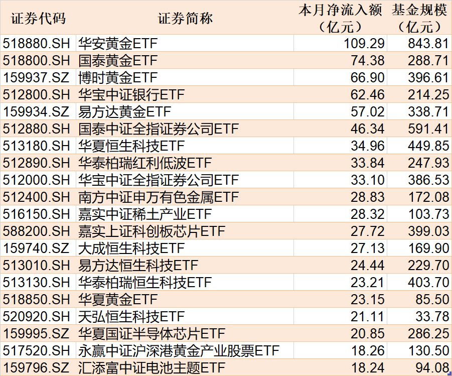 截至 10 月 23 日,本月资金净流入额居前 20 的 ETF 名单如下: