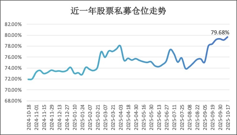第三方评价机构私募排排网最新数据显示,截至 2025 年 10 月 17 日 (因信息披露合规等原因,私募净值及仓位测算数据相对滞后),股票私募仓位指数升至 79.68%,较前一周上涨 0.55%,创近一年新高。从趋势看,自 2025 年 8 月以来,该指数累计上涨 5.75%,加仓趋势显著。