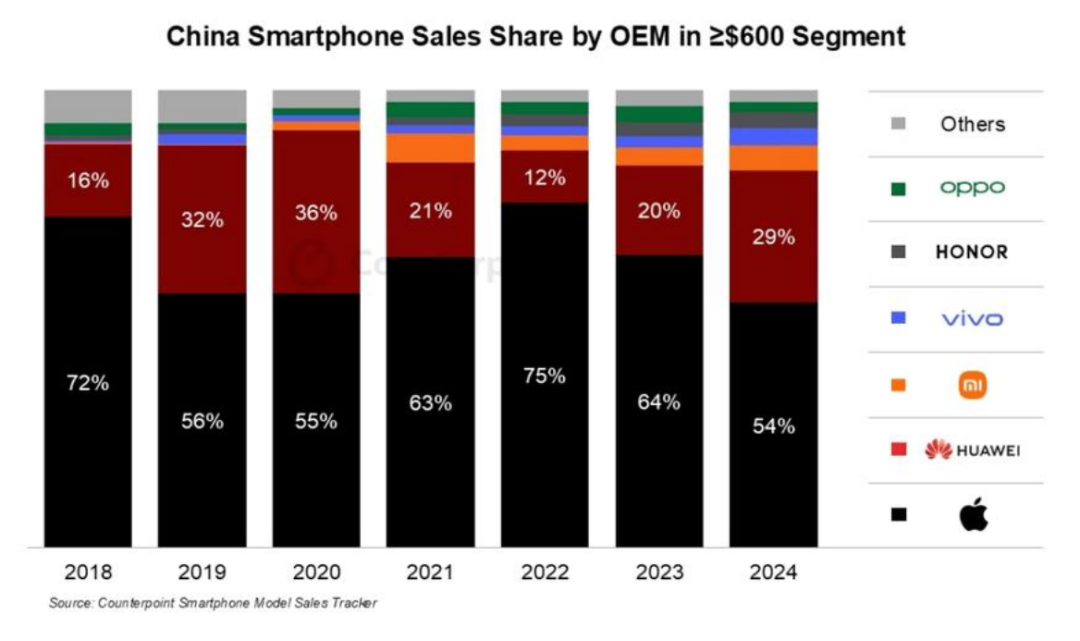 根据 CounterPoint 数据,在国内 600 美元 (4K+) 以上价位段的手机市场中,苹果一直处于领先地位,但苹果在该价位段的占有率已由 2022 年的 75% 降至 2024 年的 54%。