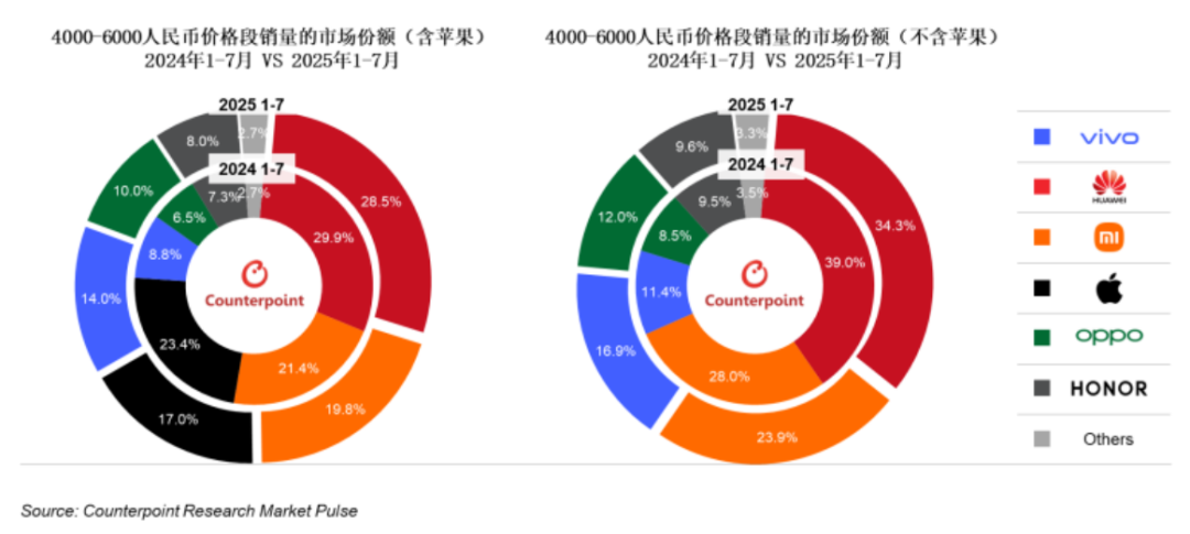 与之形成鲜明对比的是,国产手机厂商在高端市场的存在感正在扩大。根据调研机构 Counterpoint Research 数据,在 2025 年 1-7 月 4000-6000 元的价位段中,华为、小米、vivo 组成的国产新阵营,已经拿下除苹果之外的超 75% 的市场份额。