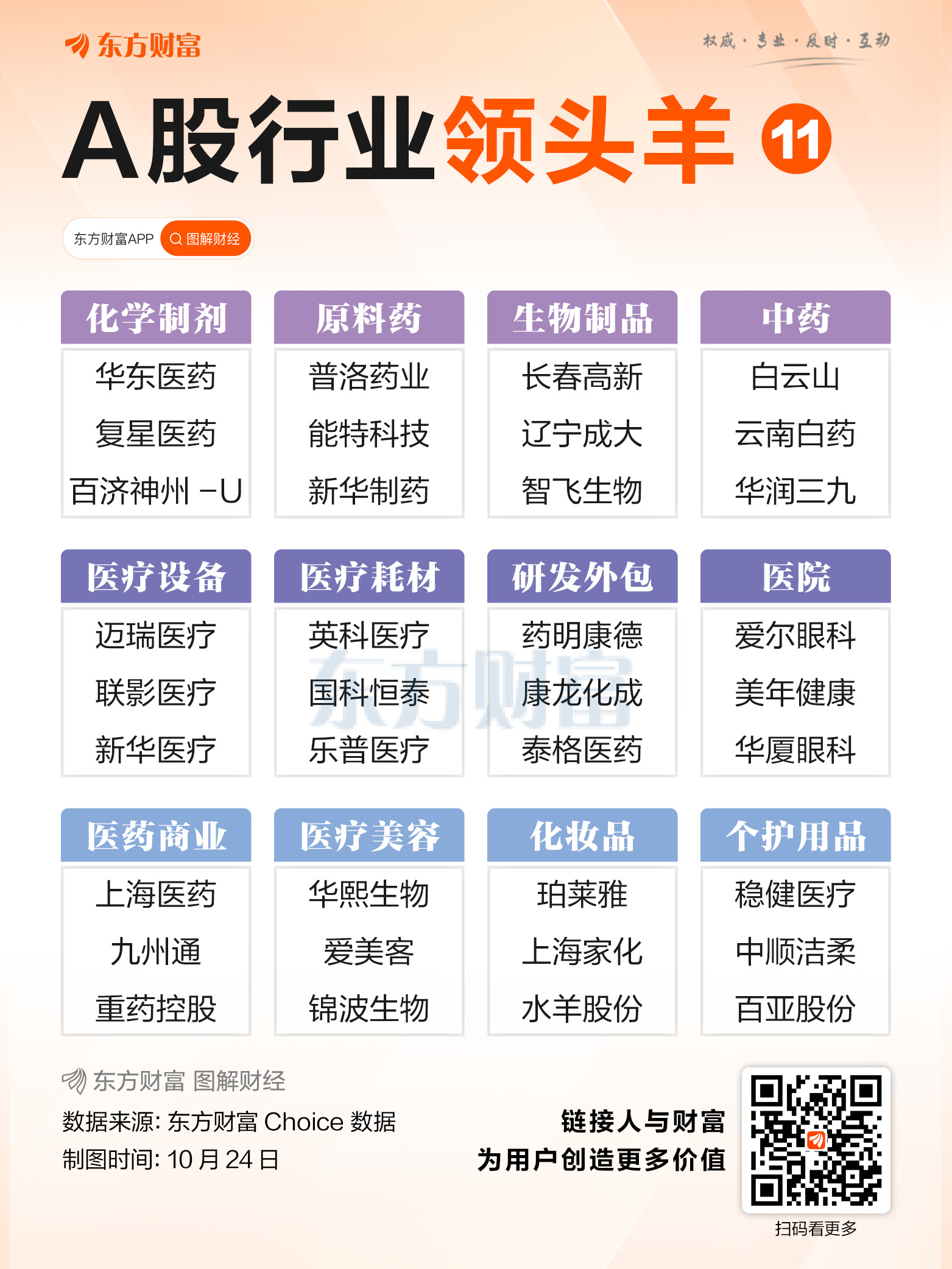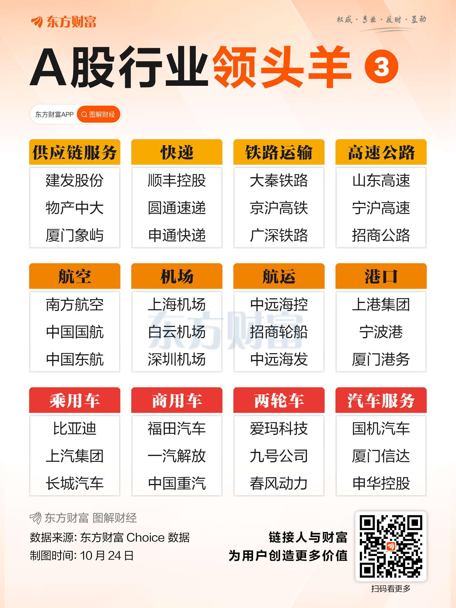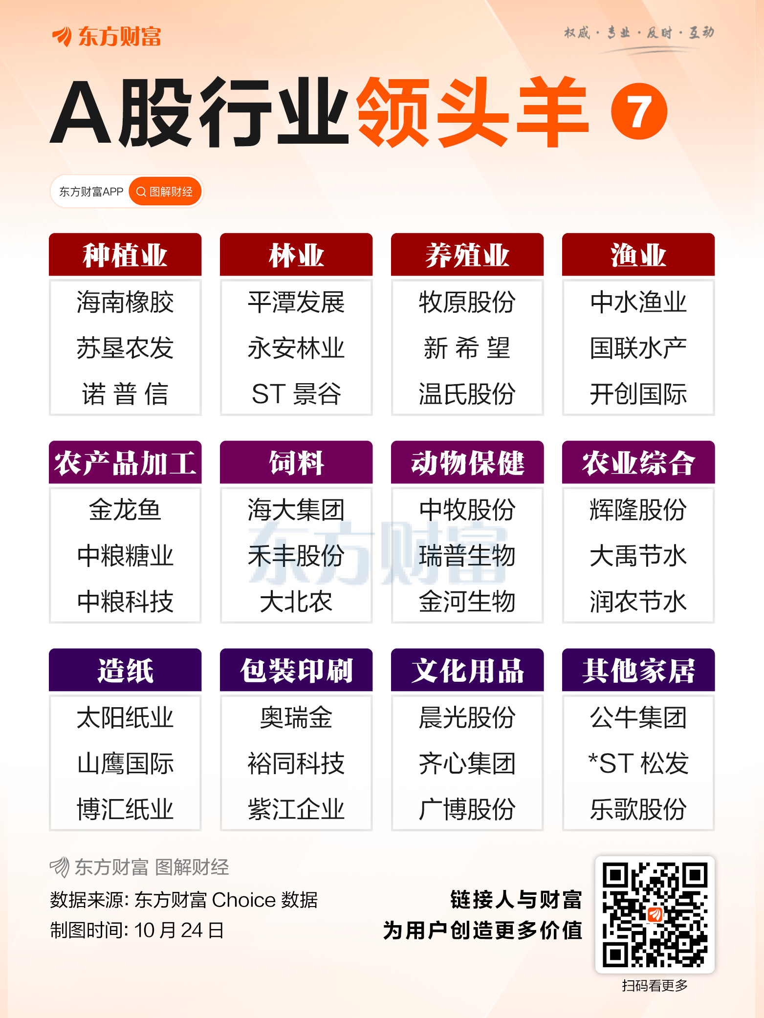 根据东方财富Choice 数据,本文筛选出了各行业最新营业总收入前三的个股作为行业 「领头羊」,总计包含申万一级行业 (除综合行业外)30 个,涉及申万二、三级行业 168 个。