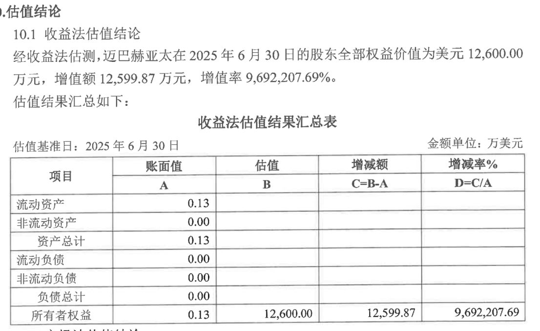 《每日经济新闻》 记者注意到,10 月 9 日发布的 《上海老凤祥有限公司拟通过控股子公司增资所涉及的迈巴赫奢侈品亚太有限公司股东全部权益价值估值报告》(以下简称 《估值报告》) 就曾提及,经收益法估算,迈巴赫亚太在 2025 年 6 月 30 日的股东全部权益价值为 1.26 亿美元,增值额约 1.26 亿美元,增值率 9692207.69%;经市场法估测,迈巴赫亚太在 2025 年 6 月 30 日的股东全部权益价值为 1.32 亿美元,增值额约 1.32 亿美元,增值率 10153746.15%。收益法与市场法估算后,存在 600 万美元的价差,差异率 4.76%。